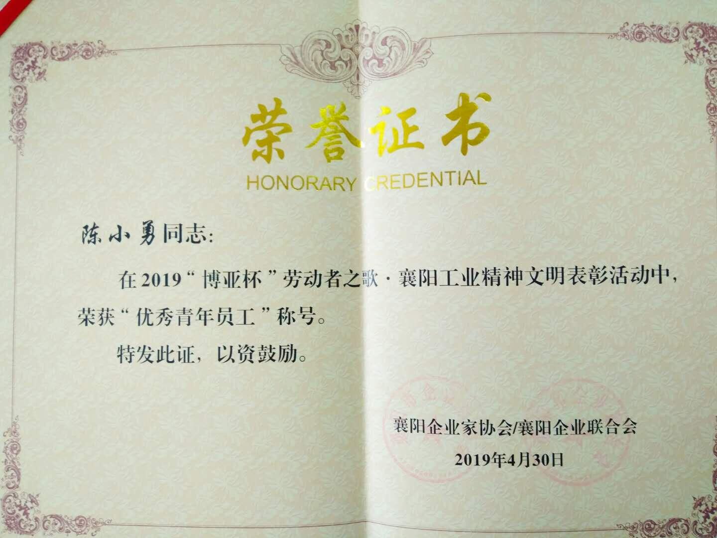 土生土长、自学成才的工程师,也能登上大雅之堂!4月30日下午,在襄阳企业家协会、襄阳企业联合会举行的2019年“博亚杯”劳动者之歌·襄阳工业精神文明表彰会上,新昇电气有限公司的土工程师陈小勇,喜获“优秀青年员工”荣誉称号。 “小个子、大能量,顶得上、能打赢”……这是公司同事们对陈小勇的形象点评。由他操刀设计的各类各型变压器在业内广受好评;他本人也数度被评为先进生产者。据悉,老河口市仅有两人获此殊荣。(通讯员: 朝晖)